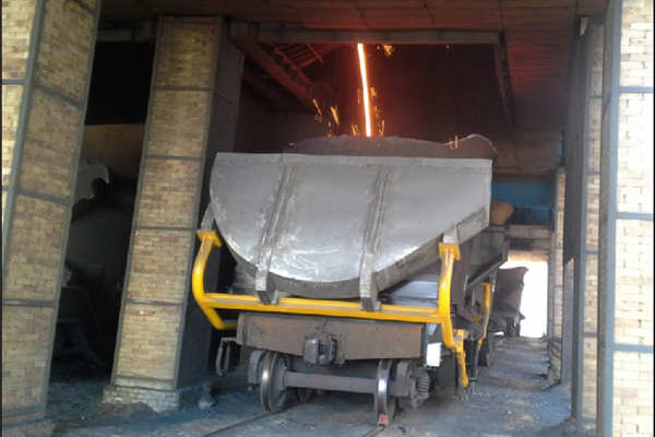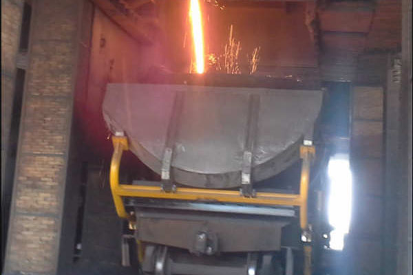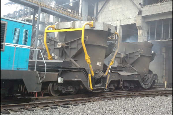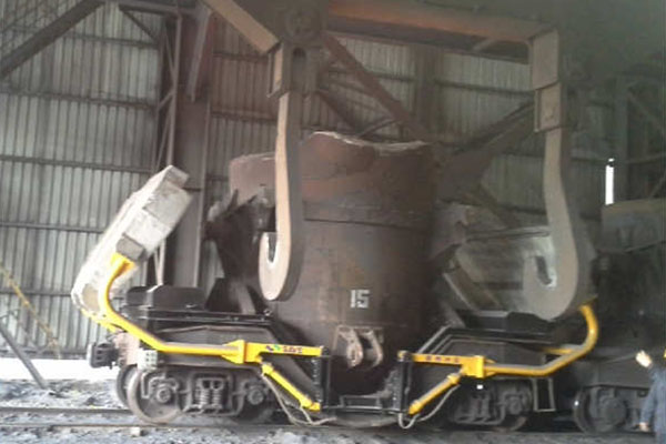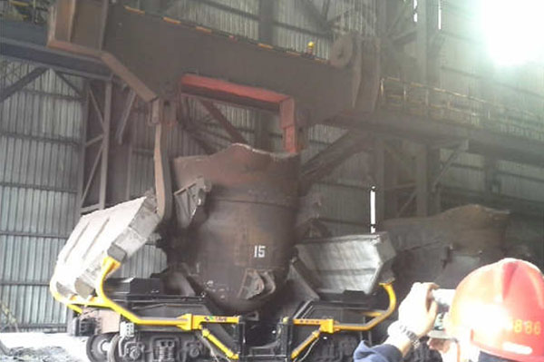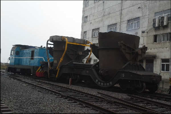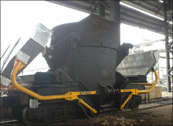 铁包加盖装置(开盖状态)与铁水罐、车组合,铁包加盖装置与铁水罐、车无缝嵌装,独立成套。