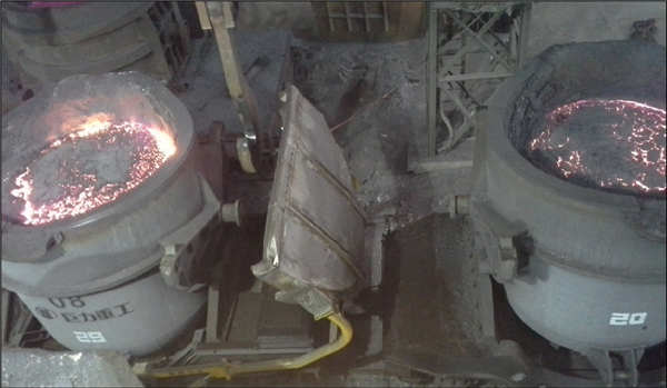 加盖与不加盖铁包满包铁水渣层视觉对比。左侧为加盖保温铁包,右侧为不加盖铁包。
